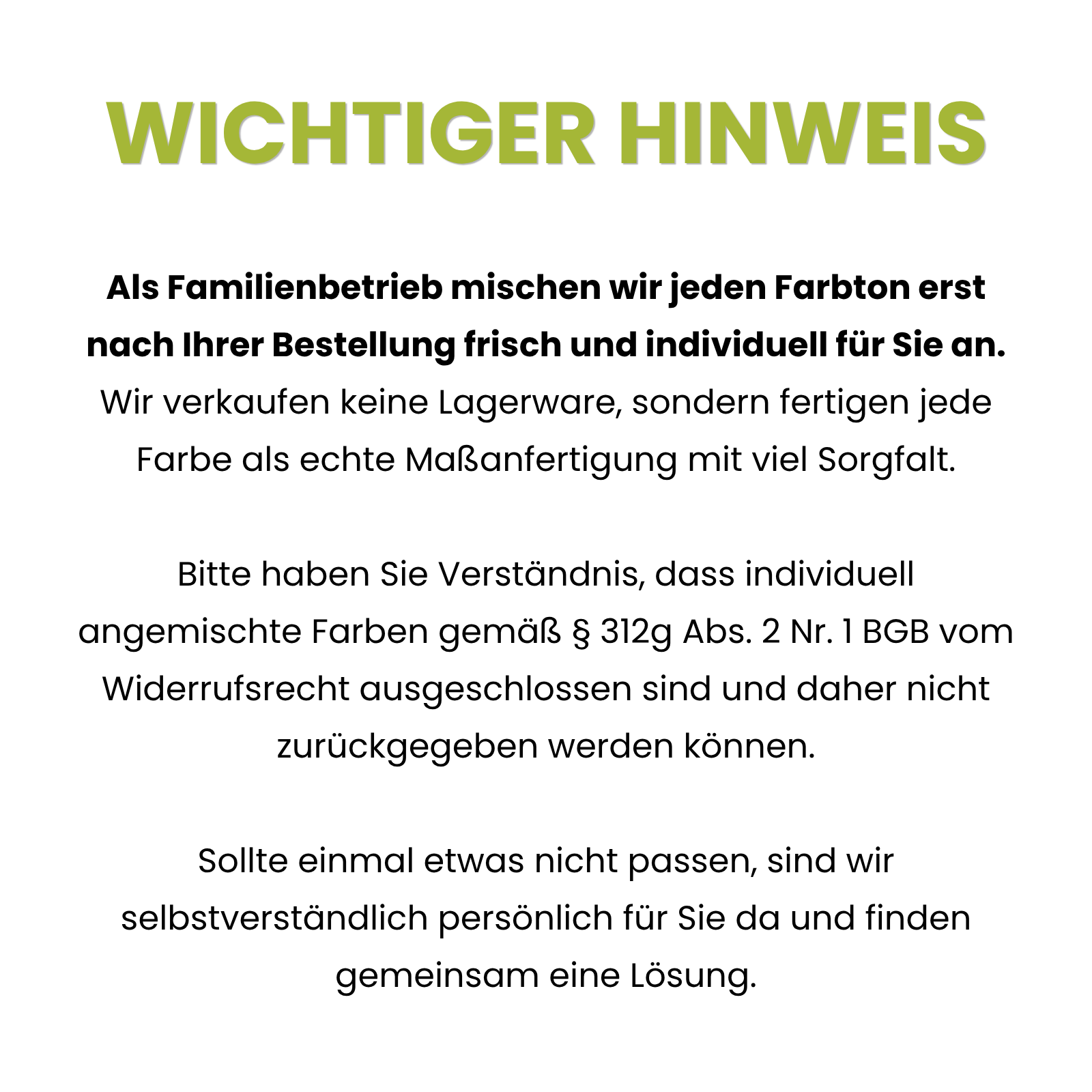 Der ausgewählte Farbton wird speziell für Ihre Bestellung angemischt, daher sind Rückgaben bei uns nicht möglich. (Nach § 312 d Abs. 4 BGB besteht kein Widerrufsrecht bei Sonderanfertigungen) Bei Fragen oder Schwierigkeiten mit der Lieferung sind wir selbstverständlich weiterhin für Sie da. Weiße Farbe und Malerbedarf können weiterhin zurückgegeben werden.