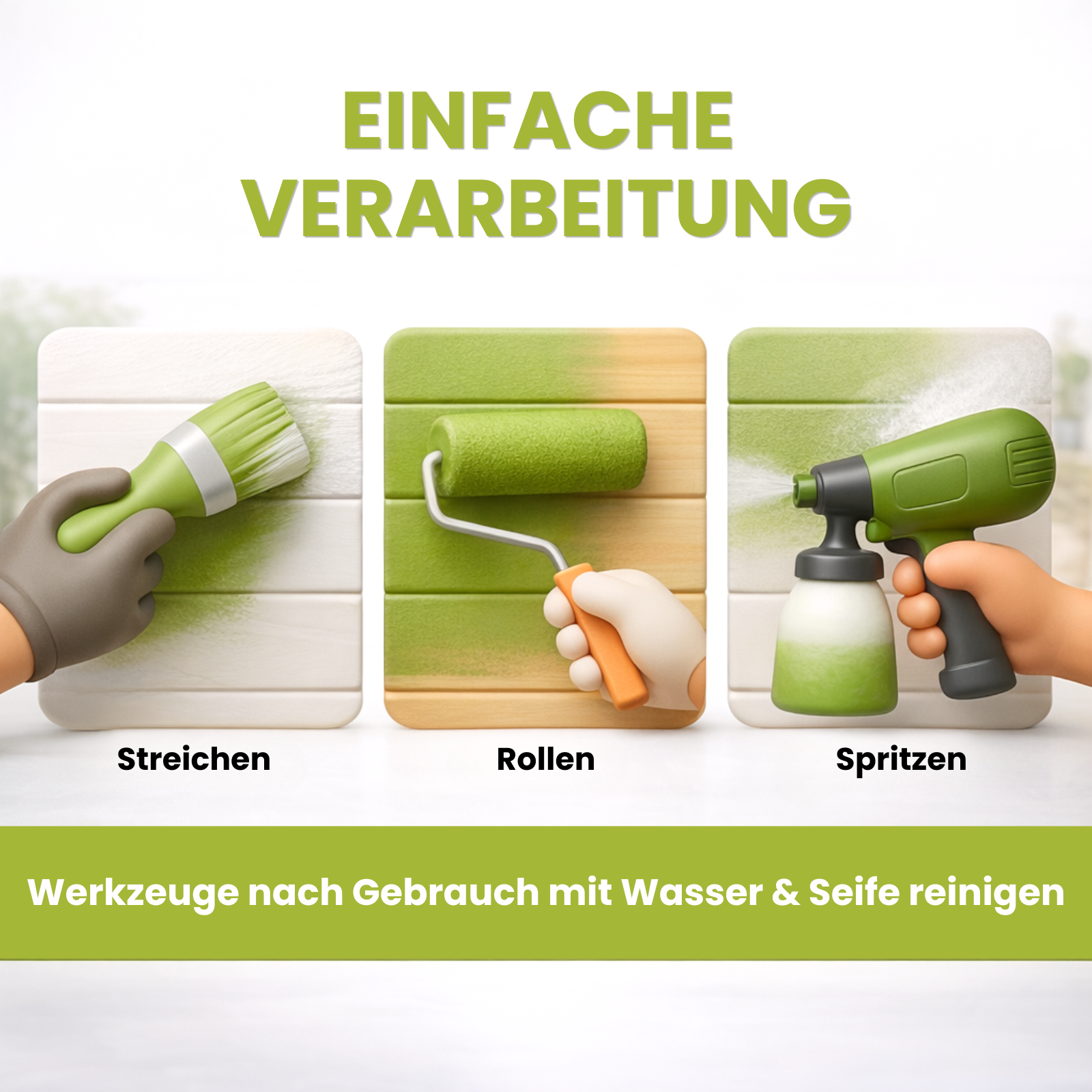 - Werkzeuge: Pinsel, Rolle, Spritzpistole