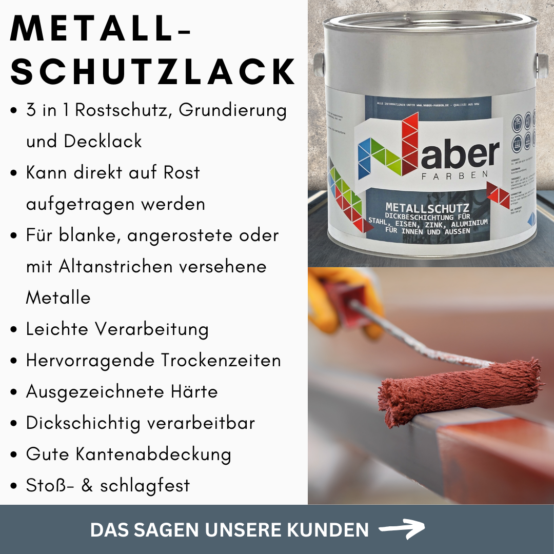 Naber Metallschutz ist ein Einschichtlack auf Alkydharzbasis mit hervorragender Deckkraft. Metallbeschichtung, Grund-, Zwischen- und Deckanstrich in einem.