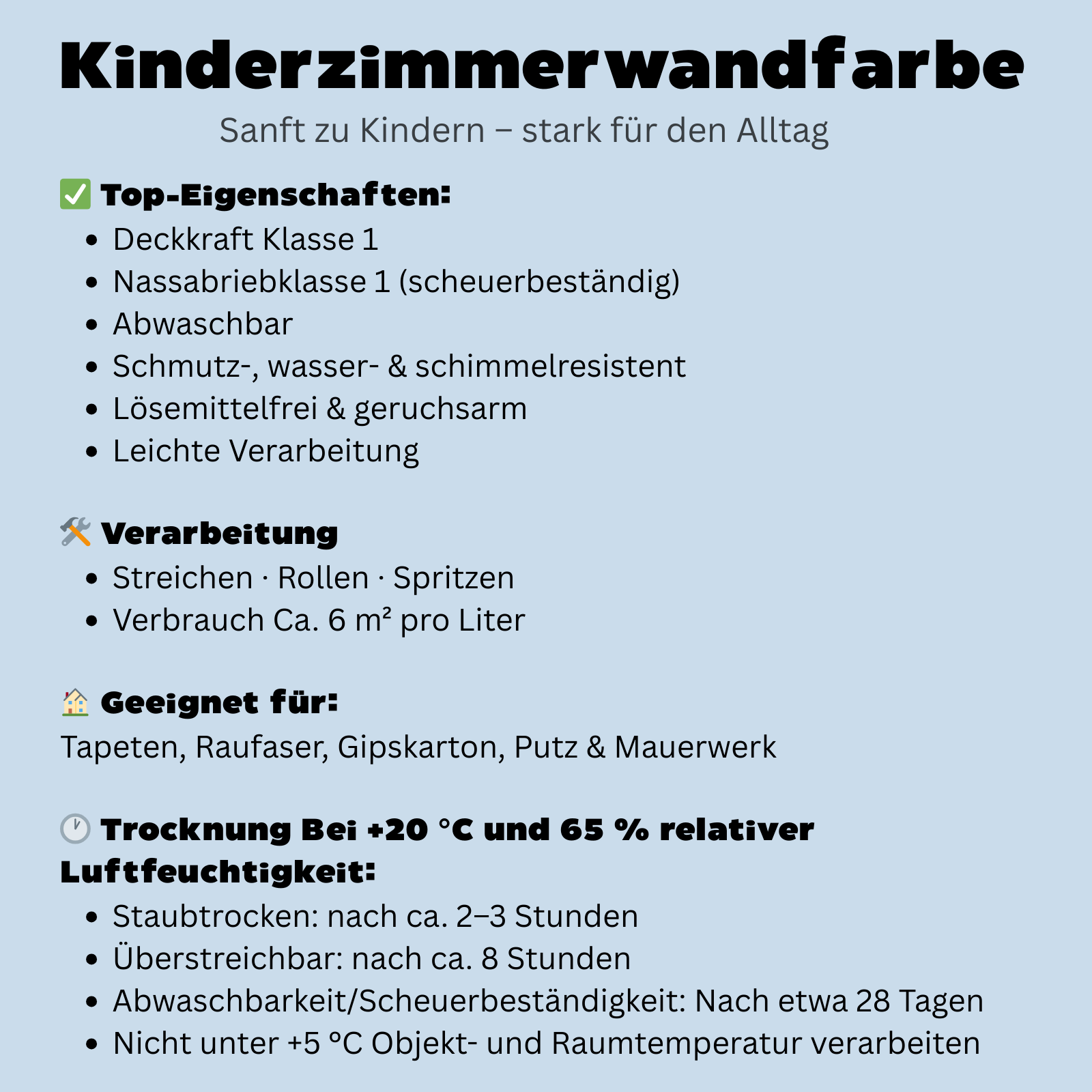 Unsere Kinderzimmerfarbe ist die ideale Wahl für stark beanspruchte Wände – perfekt für Räume, in denen gespielt, gemalt und gelacht wird! Dank ihrer hochwertigen Rezeptur lässt sie sich leicht reinigen: Lebensmittelrückstände oder Flüssigkeiten können einfach mit Schwamm und Wasser entfernt werden – ganz ohne Chemie.