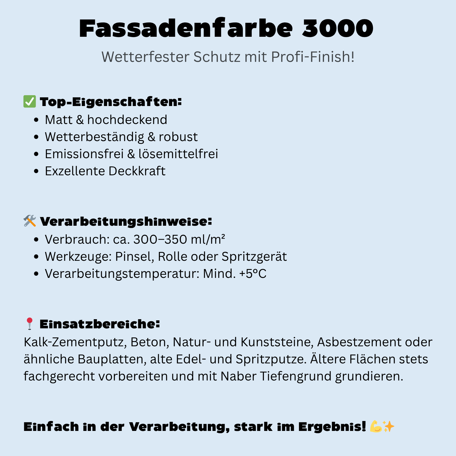 Die Naber Fassadenfarbe 3000 ist eine hochwertige, matte Fassadenfarbe mit exzellenter Deckkraft. Ideal für wetterfeste und langlebige Anstriche im Außenbereich – einfach in der Verarbeitung, stark im Ergebnis!