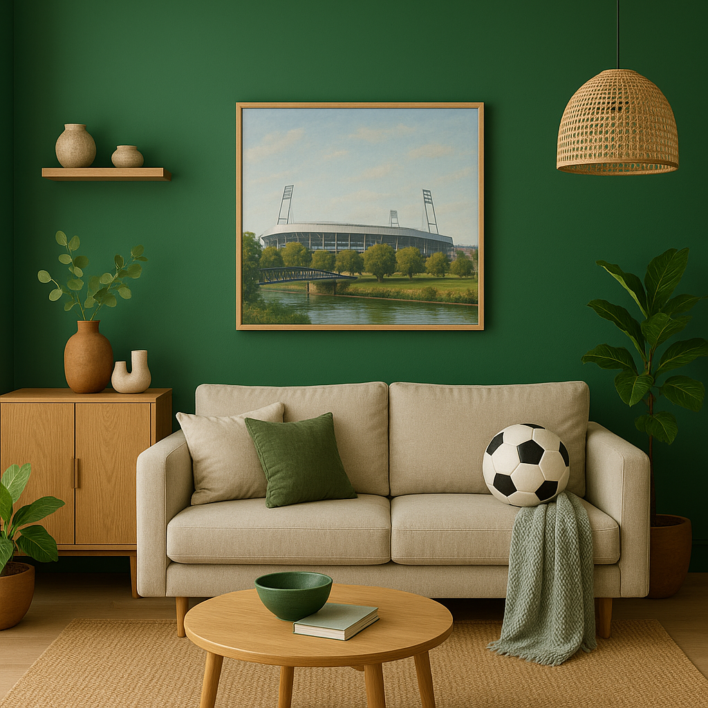 Unser Farbton „Wesergrün“ ist eine intensive grüne Wandfarbe, deren Charakter an die traditionellen Vereinsfarben von Werder Bremen erinnert. Es handelt sich nicht um ein offizielles Vereinsprodukt, sondern um eine eigenständig entwickelte Farbe, die Fans ein kraftvolles, lebendiges Grün für ihr Zuhause bietet.